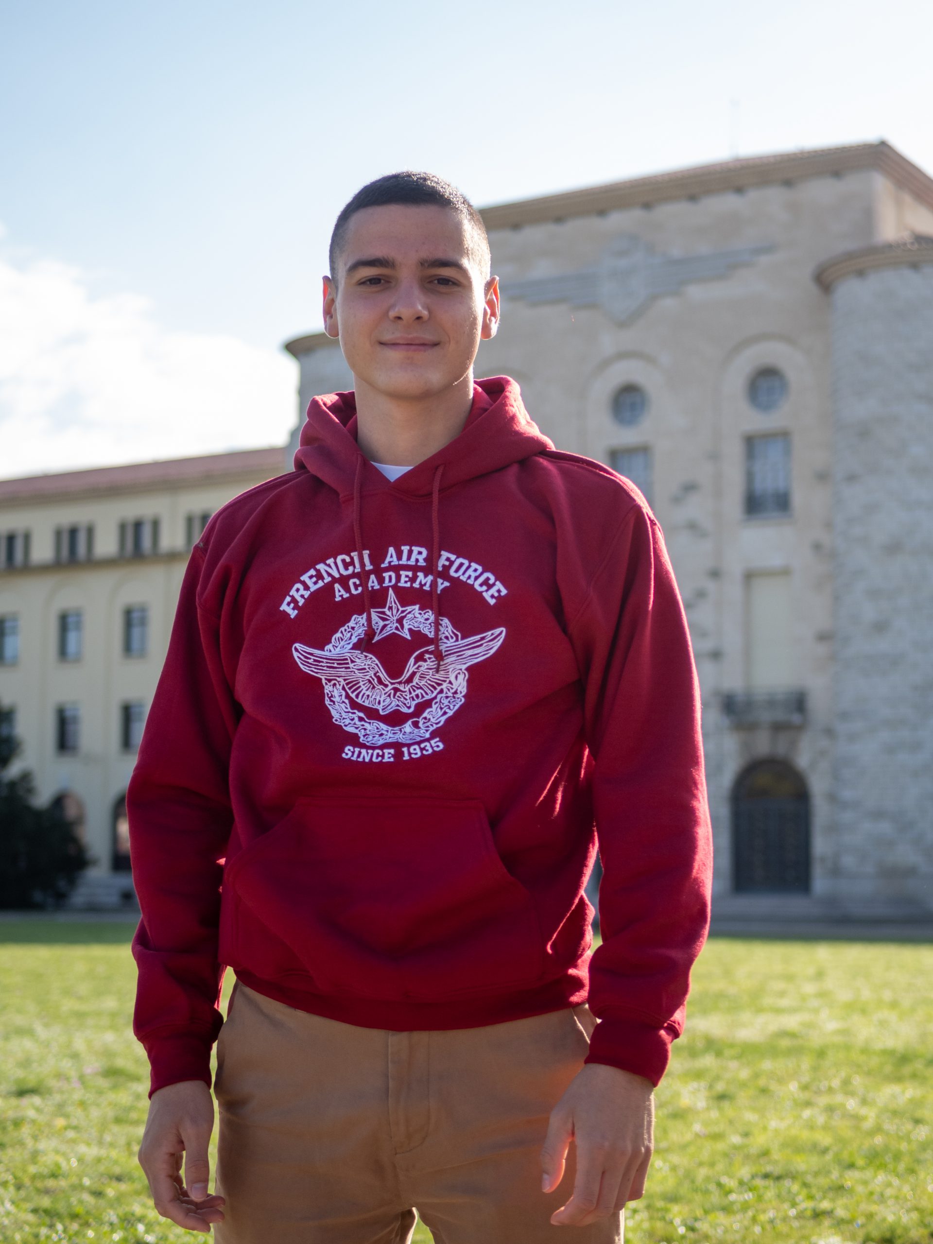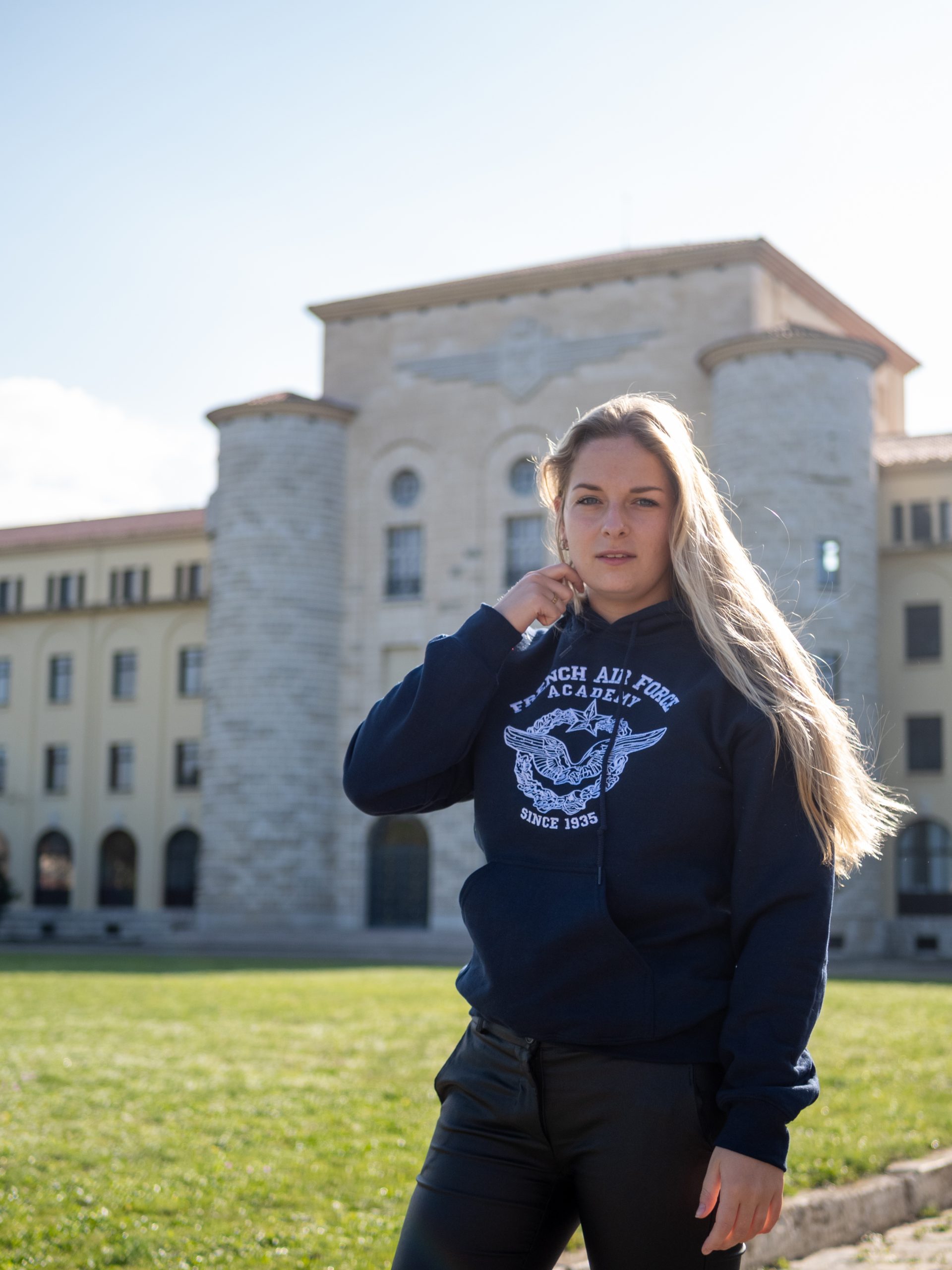Sweatshirt de l’École de l’air avec liseré bleu-blanc-rouge au dos. Disponible dans de nombreuses couleurs, des tailles XS à XL.